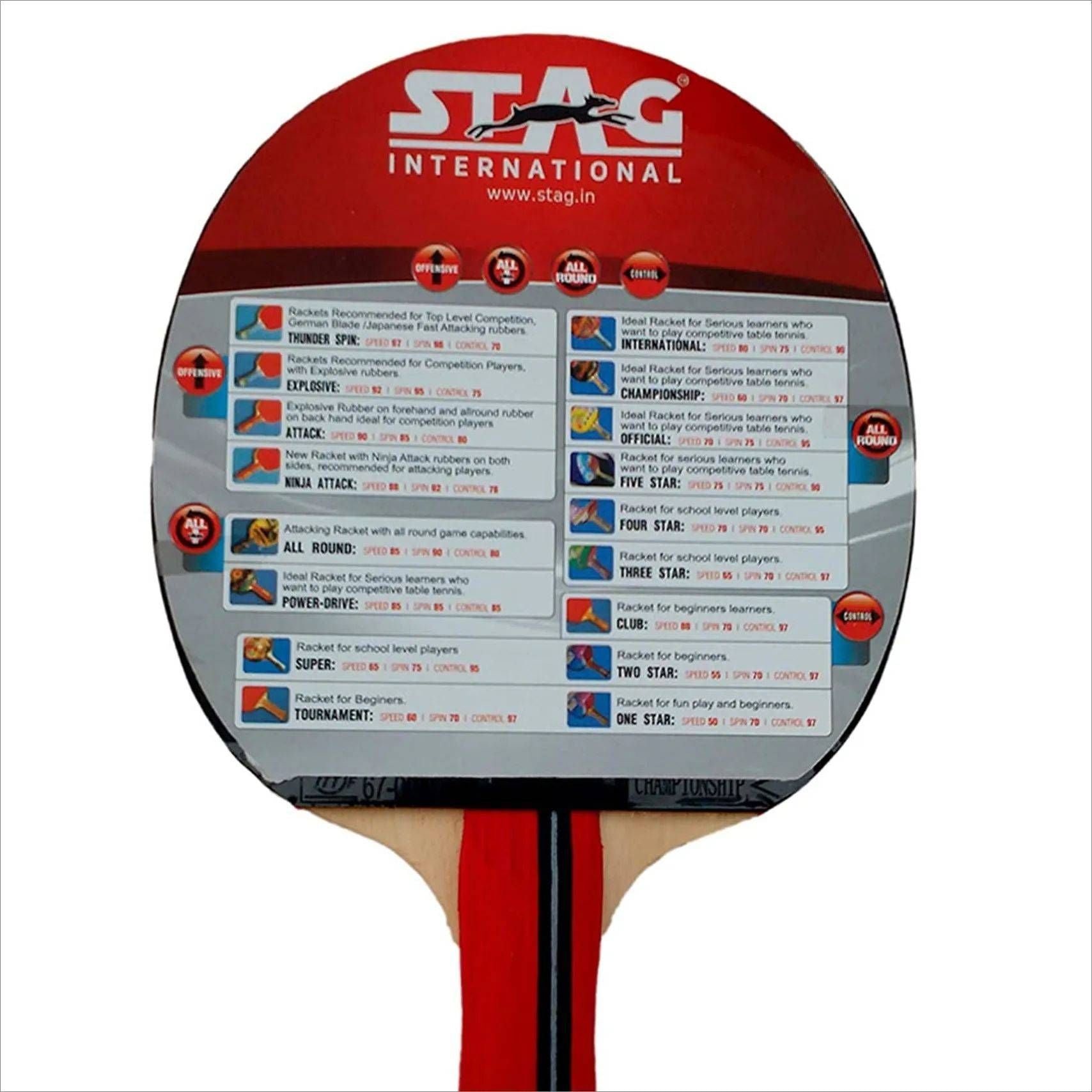 The Stag Championship Table Tennis Racquet offers excellent control and balance for intermediate to advanced players. Engineered with a lightweight ply, it ensures quick racket handling and precise forehand shots. Delivering a blend of speed (60), spin (70), and exceptional control (97), this ITTF-approved racquet supports an offensive playing style while allowing you to refine your defensive skills. Ideal for those looking to elevate their game with a reliable, high-performance paddle at an affordable price.